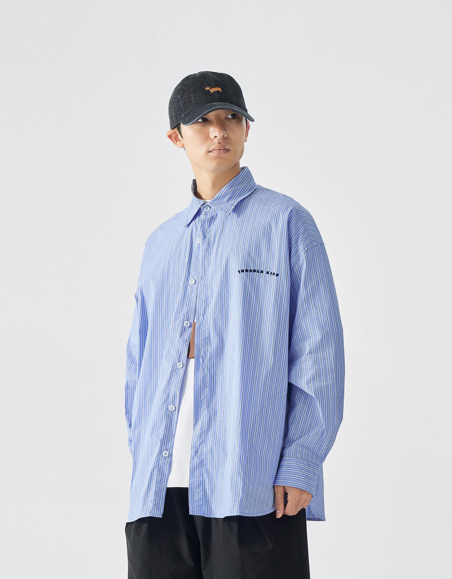 Focusing on versatility and comfort, this shirt features subtle adjustments to the silhouette and stripe design, breaking away from the monotony of a typical striped shirt. The blue and white striped pattern has varying distances between the stripes, adding visual depth and layering to the overall design. The high-density blended fabric construction ensures a comfortable, lightweight and breathable wear, while retaining the inherent quality and drape of the material, preventing an overly loose or misshapen appearance. The chest is adorned with an embroidered logo print, while the curved, asymmetric hemline (shorter in front, longer in back) provides ample space and styling flexibility.